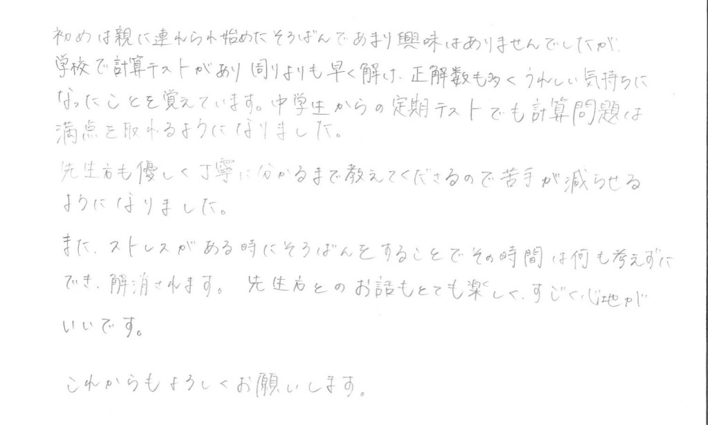「こんなに長い間そろばんを続けてくれるとは思っていなかった」生徒です。